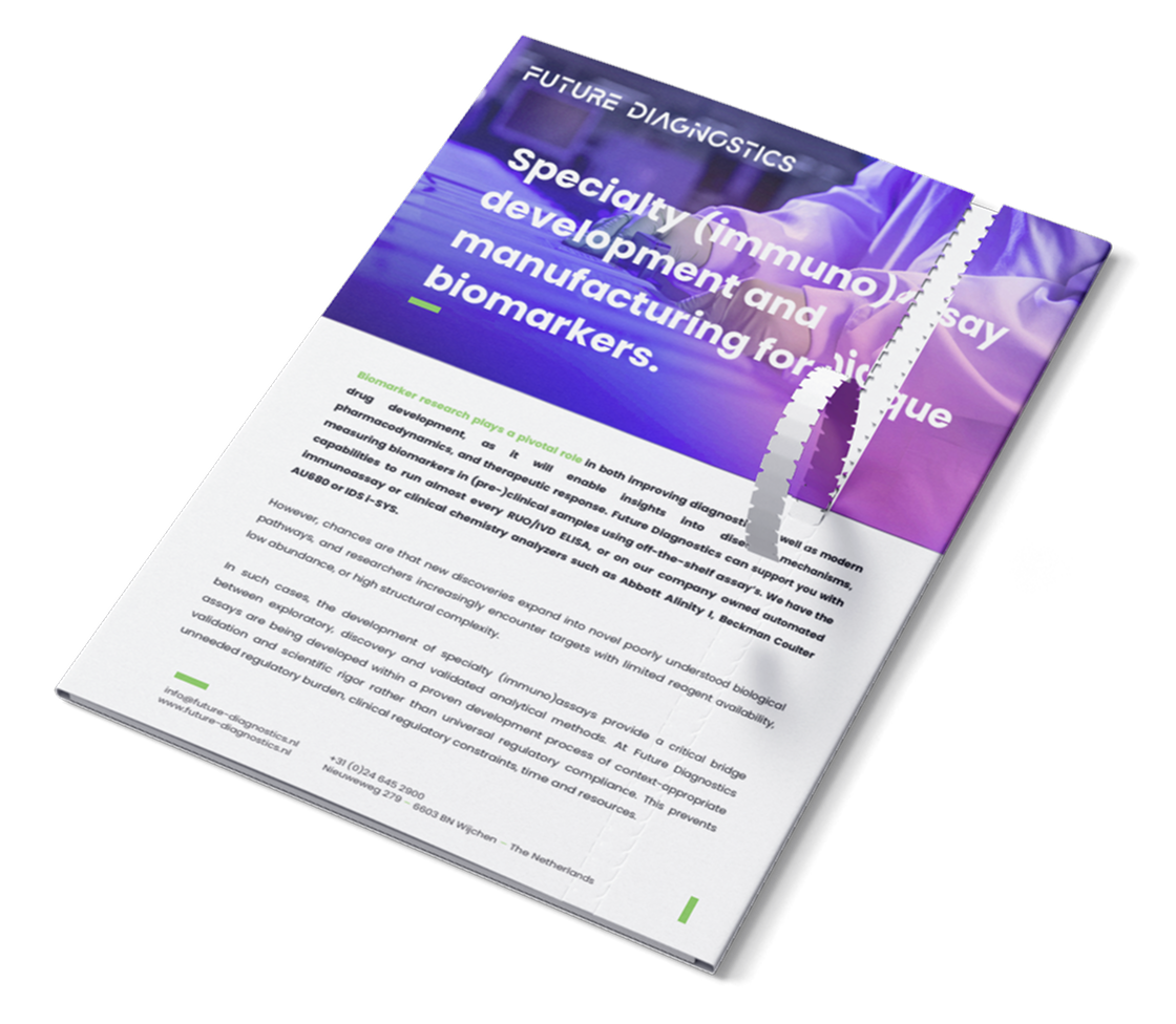 Looking to bring your novel diagnostic assay to market? Future Diagnostics helps you demonstrate performance with proof-of-concept experiments on industry-leading clinical immunoassay analyzers. With decades of expertise in IVD assay development, we provide the technical support and scientific insights needed to transition your assays from the lab to the global diagnostics market. Our services include: